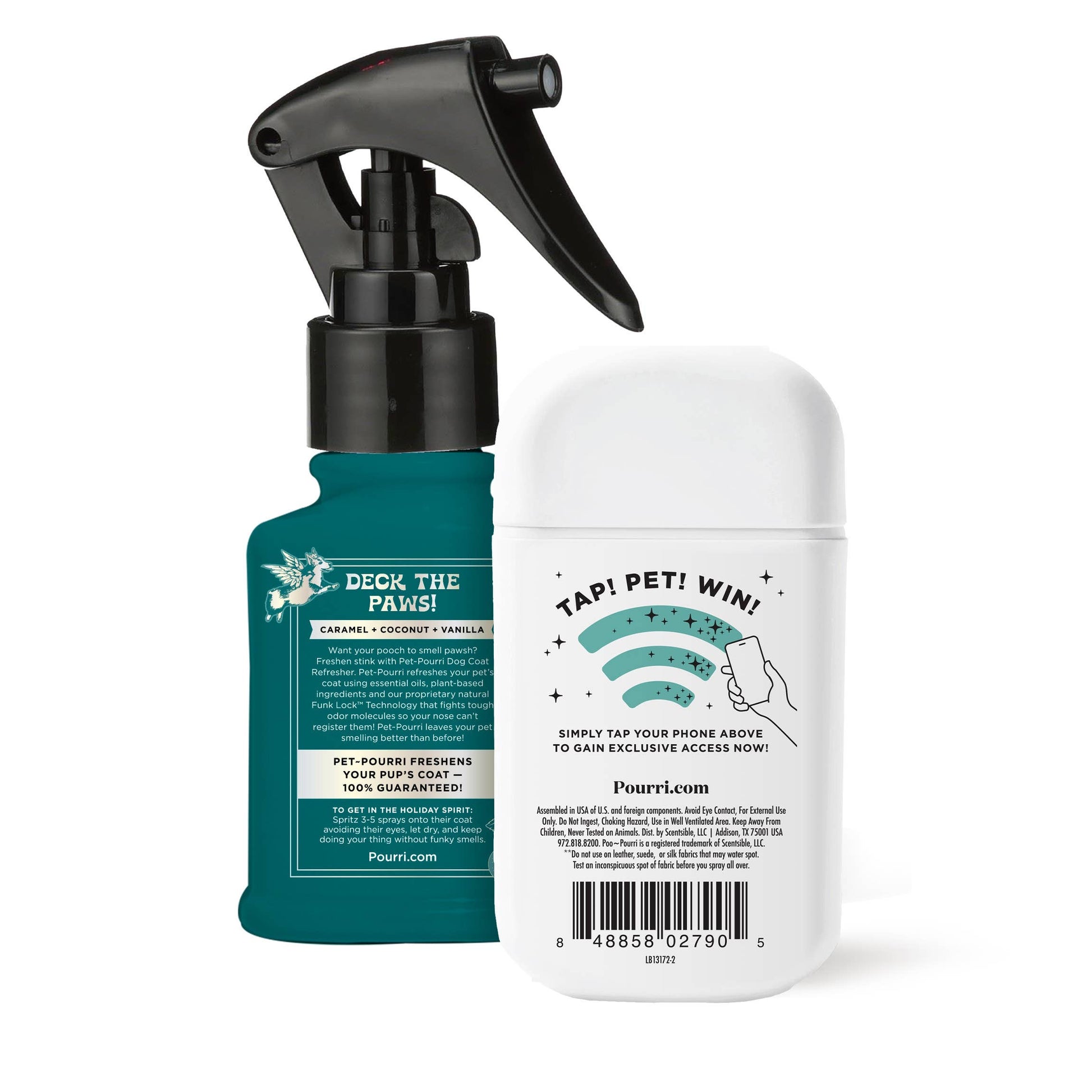 1oz Pocket Pawsitively Fresh: pineapple + jasmine + pear • 2oz Jingle Paws Dog Coat Refresher Spray (New Scent): caramel + coconut + vanilla The ultimate holiday gift for pet lovers who take their pets (and their smell) seriously.